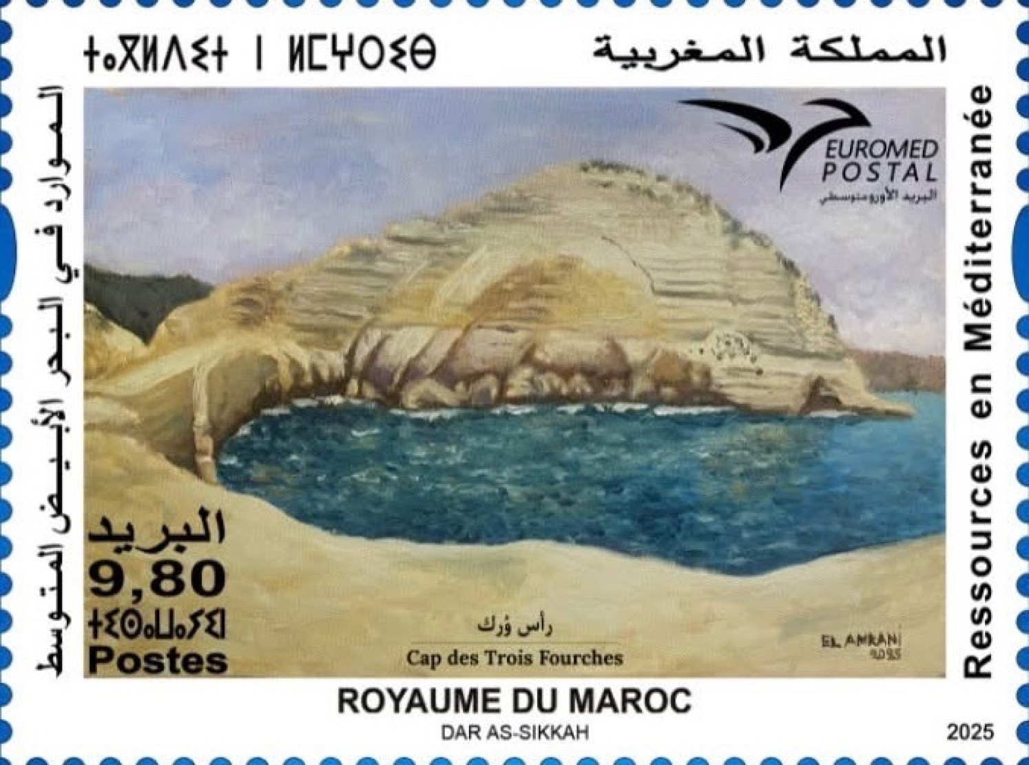 The 40th anniversary of the relationship between Oman and Russia was finally released on December 10, 2025 (after 5 successive announcements of changes of issue dates). The issue initially intended to celebrate the Omani explorer Ahmed bin Majid and the Russian traveler Afanasy Nikitin, led finally to a common stamp showing an old map, taken from the manuscript Kharīdat al-ʻAjāʼib wa Farīdat al-Gharāʼib, or ‘The Pearl of Wonders and the Uniqueness of Things Strange’ (written 1419), by Oman scientist Umar ibn Muẓaffar al-Wardī (died 1447). In both countries, the stamps have been released as miniature sheets [3×3], containing 9 stamps for Oman, but with central label for Russia, so, only 8 stamps in the Russian miniature sheet. Oman released another souvenir sheet, showing the two explorers, with a perforation centered over the portrait of the Omani traveler. This item shows a design which could have been used by Russia, simply by shifting the perforations, but this was not translated in a Russian product. The choice of the map as common design, may also explain the delays, probably upon reluctancy of the Russian post to use the Omani proposal (which is not a standard Russian stamp printing form).