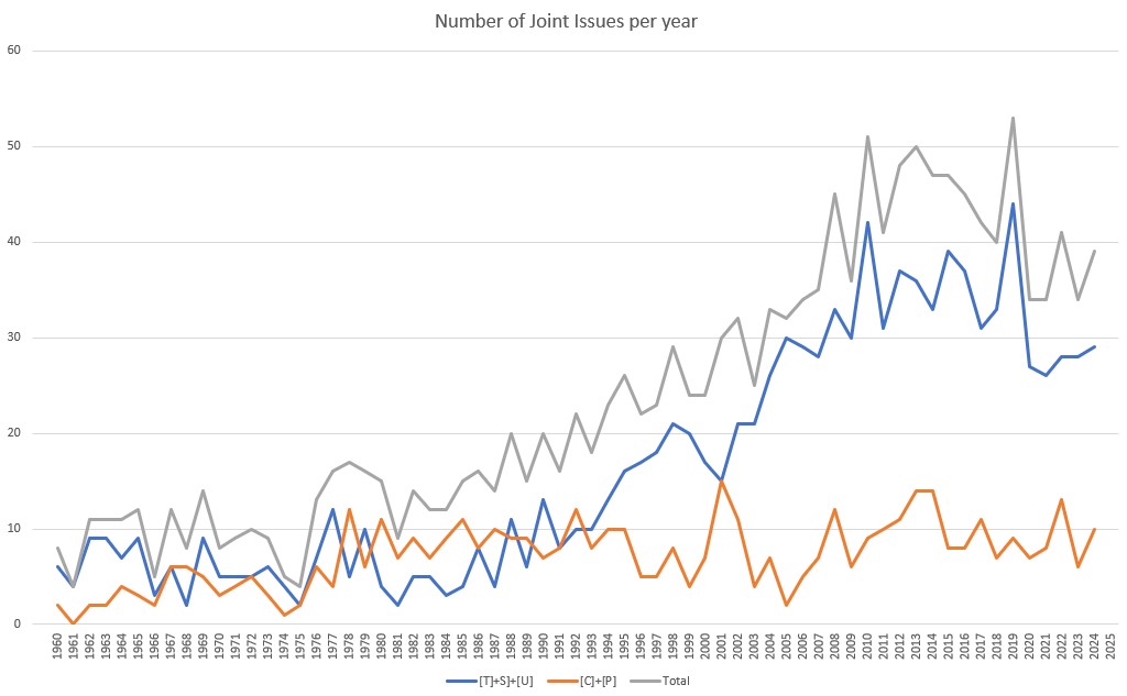 On October 7, 2025, France and Japan celebrated the Week of Letter Writing with a twin issue depicting gardens. On one side the French Vaux-le-Vicomte castle and gardens were represented, on the other one, the Gingaku-ji tempel or Silver Pavilion near Kyoto, Japan, was shown. France issued the stamps in two miniature sheets of 10, while Japan produced a single miniature sheet with 5 se-tenant pairs. Mixed official first day documents and a mixed folder with all four stamps, mint, became also available (This information was first provided by Dominique Josse, France).
