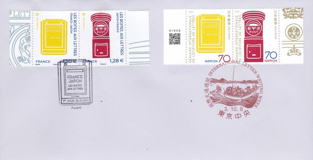 On October 7, 2025, France and Japan celebrated the Week of Letter Writing with a twin issue depicting gardens. On one side the French Vaux-le-Vicomte castle and gardens were represented, on the other one, the Gingaku-ji tempel or Silver Pavilion near Kyoto, Japan, was shown. France issued the stamps in two miniature sheets of 10, while Japan produced a single miniature sheet with 5 se-tenant pairs. Mixed official first day documents and a mixed folder with all four stamps, mint, became also available (This information was first provided by Dominique Josse, France).