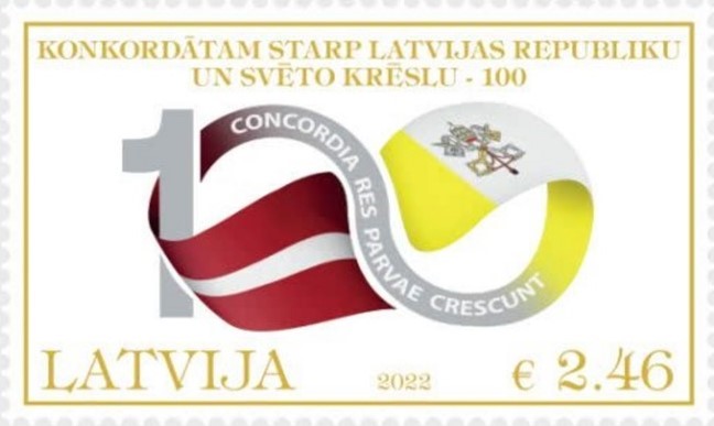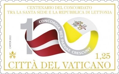 On September 1, 2022 (earlier than expected as issue date we had up to now in our files was September 9), Latvia and the Vatican State celebrated the 100th anniversary of the Concordat joining both states. Stamps are identical and show the figure “100” made of flags with the inscription “Concordia res parvae crescunt (in harmony small things grow)”. Thanks to Enzo Cafaro (Italy) and Don Birschel (USA) for having provided the information.