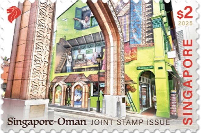 Kenneth Sequeira (Singapore) provided the first illustrations of the stamps and miniature sheets issued by the Sultanate of Oman and the Republic of Singapore celebrating their relationship established on February 21, 1985. The stamp features Muscat Street in Singapore’s Kampong Glam district, reflecting both Singapore’s heritage and its connection with Oman, through architecture and wall paintings. The stamps and souvenir sheets were released on February 21, 2025.