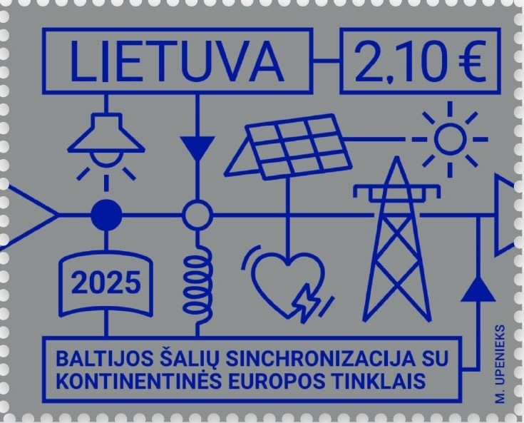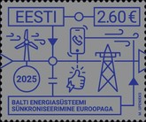 In the meantime, Estonia, Latvia and Lithuania issued similar stamps related to the integration of the Baltic States to the European electricity network. These countries disconnected their electricity grids from the old Soviet-era system (BRELL), which linked them to Russia and Belarus, and synchronized it with the European grid (ENTSO-E) on February 9, 2025. The project involved building new infrastructure, upgrading power lines, and installing synchronous condensers to stabilize the grid. The stamps were issued on March 7, 2025. The three stamps are not identical, but very similar, created by the same designer and considered as twin stamps of type [T3].