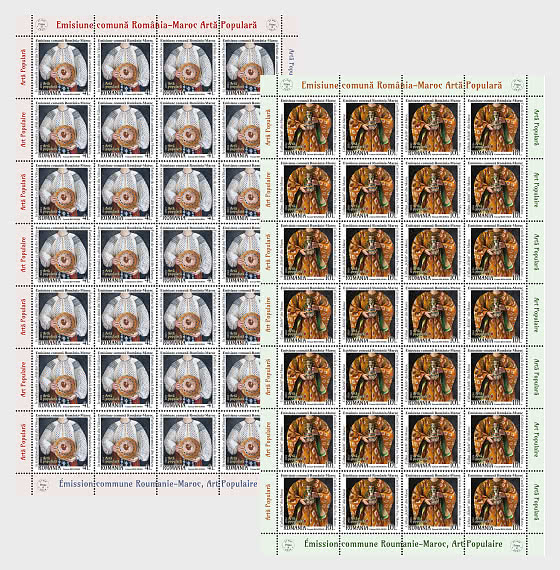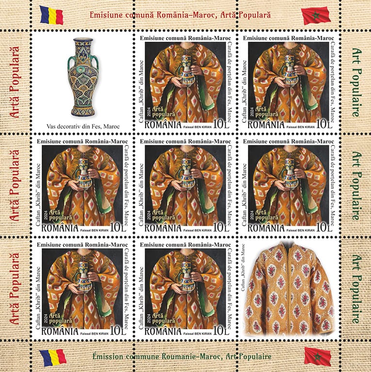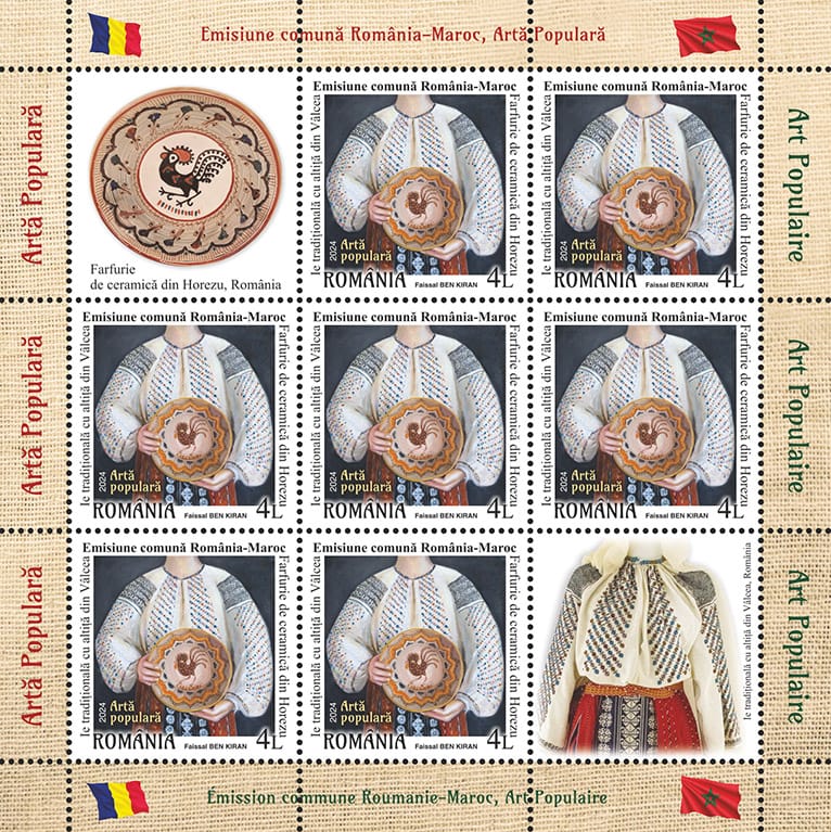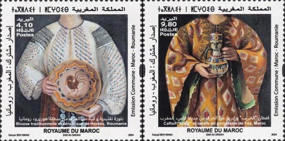 May 21, 2024: Morocco and Romania celebrate cultural relations between both countries through a pair of identical stamps related to folk art. This is a twin issue [T1] representing traditional costumes and ceramic or porcelain objects from the regions of Vâlcea and Horezu (Romania), or from Fez (Morocco) [T20240521].