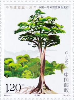 May 31, 2024: as a last minute issue, we were informed that China PR and Malaysia have issued a joint pair of stamps at the occasion of the 50th anniversary of the diplomatic relationship between both countries (Source: Adam Paish, UK). The stamps represent two local large trees (Pine and Merbau/malaka teak) from both countries.