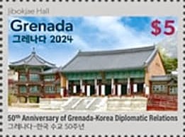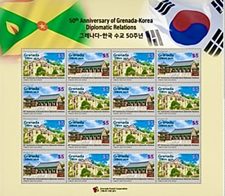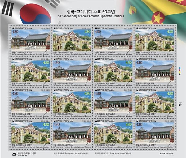 The Grenada – South Korea joint stamps celebrating the 50th anniversary of relationship were issued as scheduled on August 1, 2024. The identical pairs of stamp show the Marryshow House in St George’s, Grenada and the Jibokjae Hall (library) at Gyeongbokgung Palace, Seoul, South Korea. Se-tenant stamps were released in miniature sheets of 8 pairs, chessboard ordered.