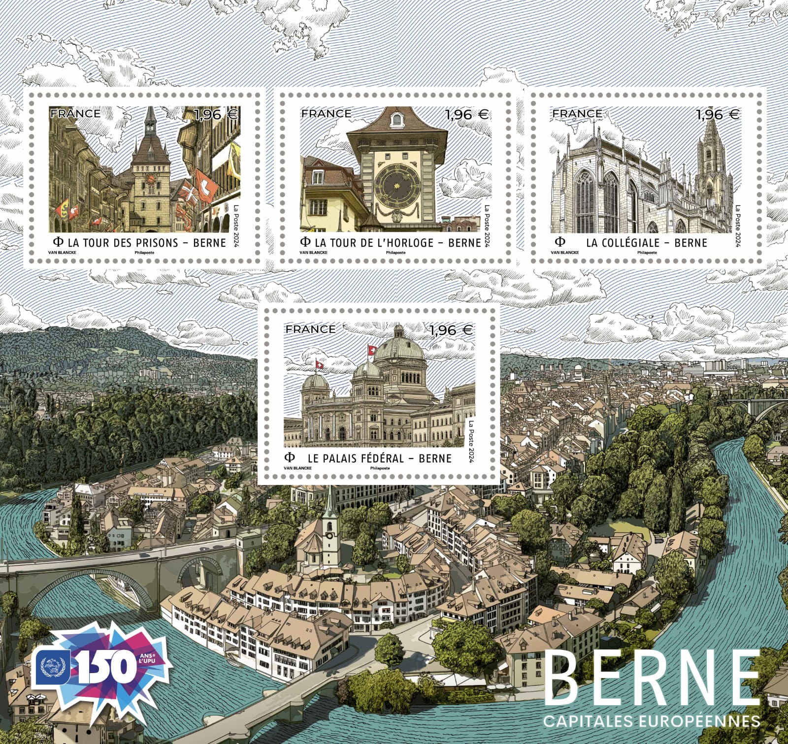 • C: the countries which use only a part of the design, actually integrating only the “150” logo and add some other illustrations. This logo can appear within the stamp, or on the margin of a souvenir sheet or within a label. Those stamps are also considered as twin or concerted issues of Type [T2] or [C2]