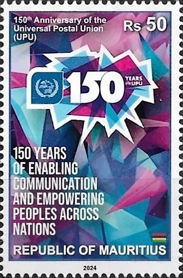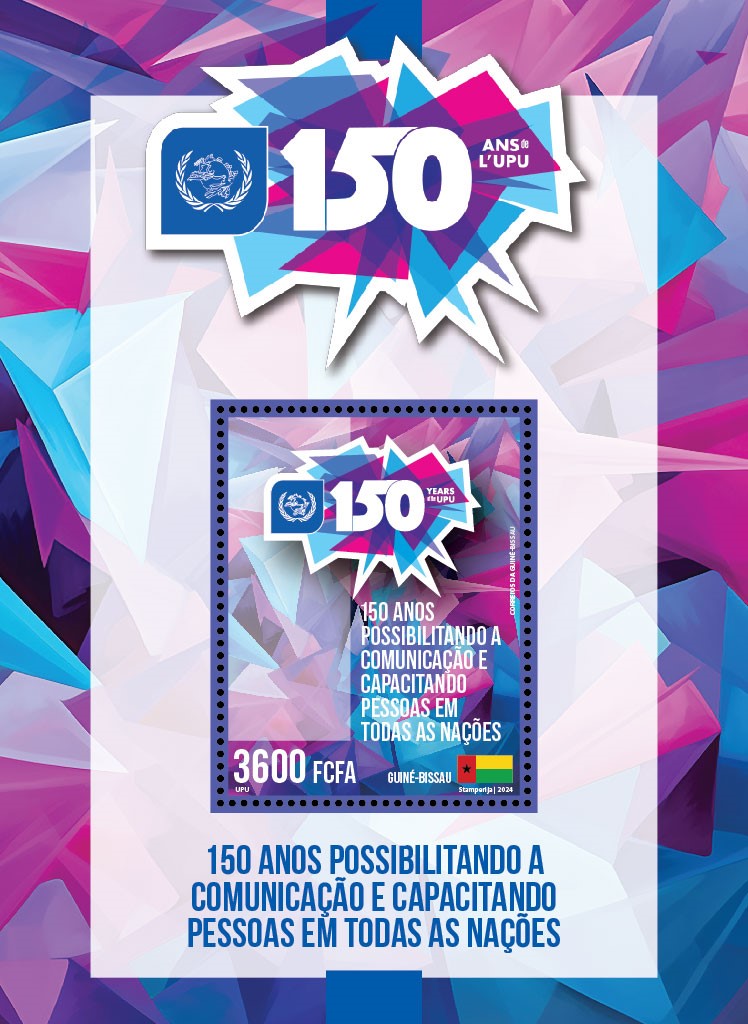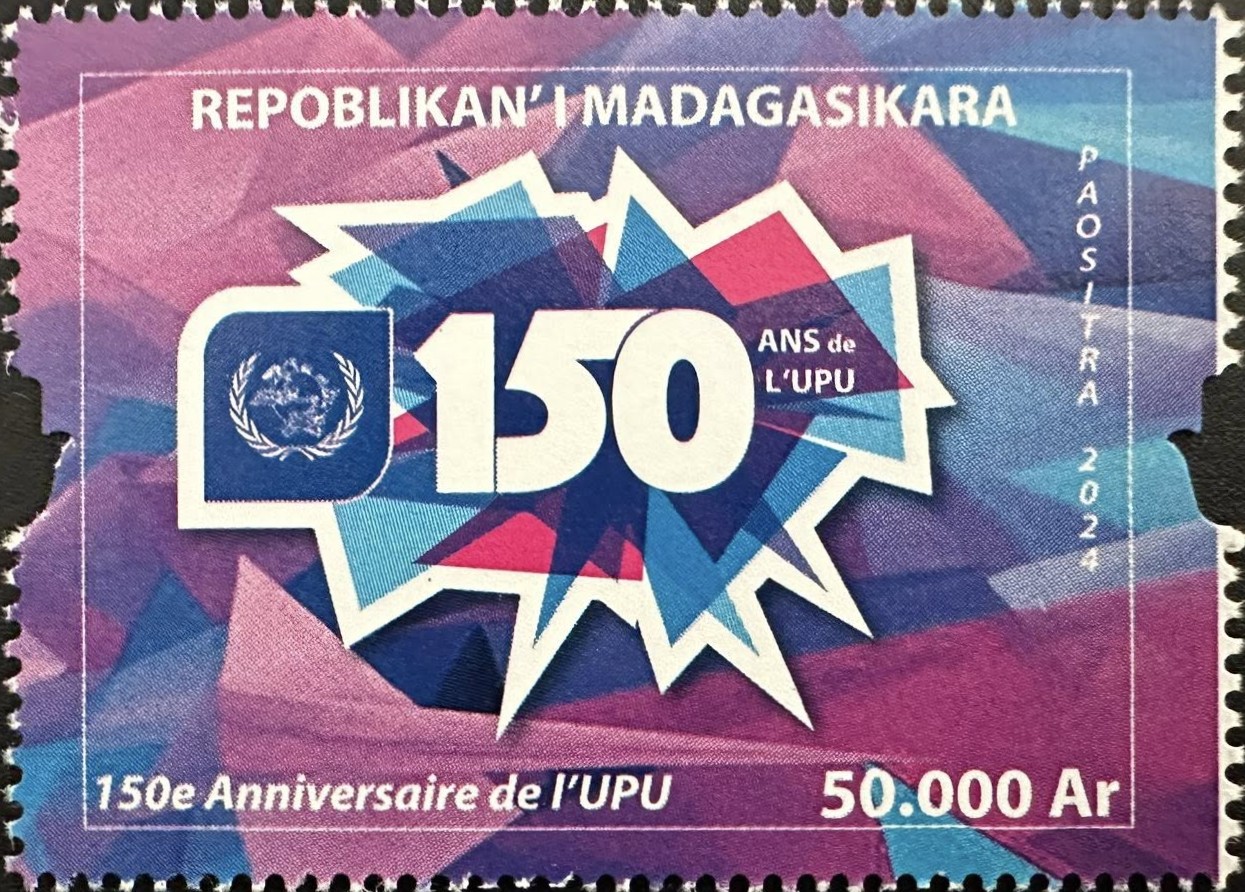 Madagascar finally joined the countries celebrating the 150th anniversary of the UPU from October 9, 2024 [T20241009] with the same common stamp. This country issued its stamp on December 30, 2024 (actually printed by the Tunisian Post Printing Office, on November 4, 2024) and produced stamps in panes of 20 [4×5] and a souvenir sheet containing a block of 4 stamps [2×2] (Source: Benjamin Busch)