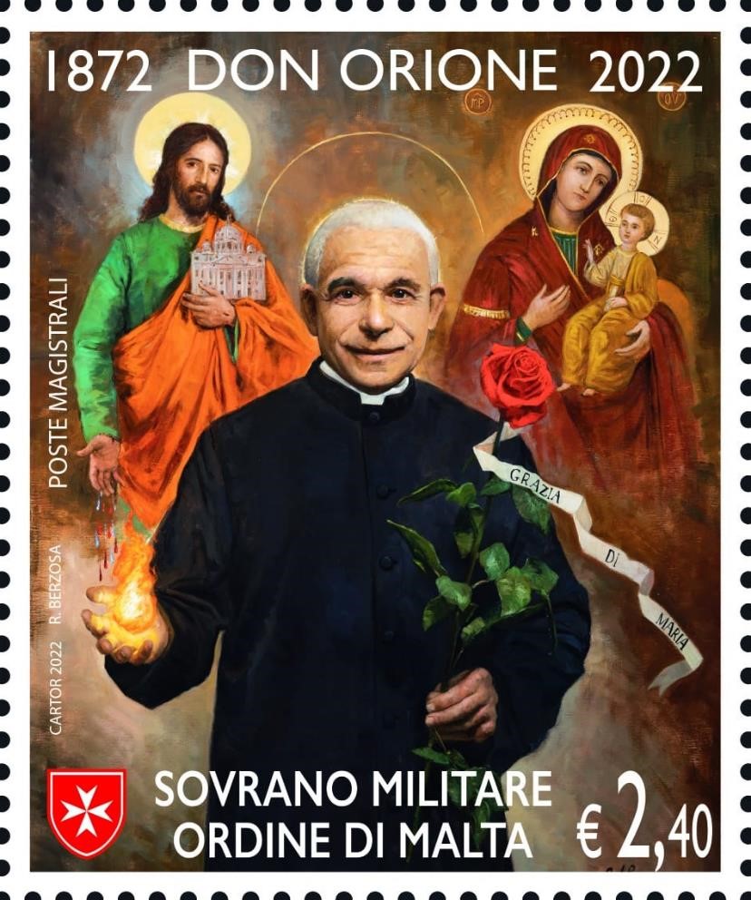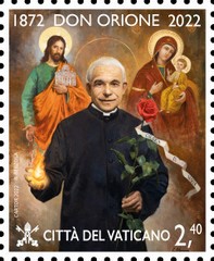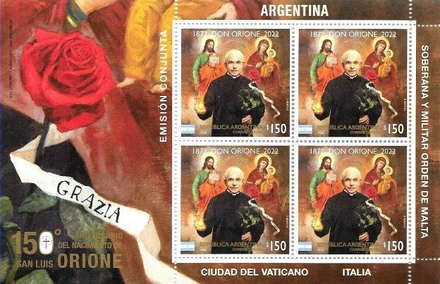 On May 16, 2022, the postal administrations of Italy, Vatican and Argentina, but also the Sovereign Military Order of Malta, issued each the same stamp showing a portrait painted by Raul Berzosa (born 1979). Each country issued the stamp in miniature sheets of 4 stamps. Only Argentina issued a smaller square size stamp. The painting shows several symbols related to Don Luigi Orione’s life and holiness. He created several missions abroad, including in Argentina (1921), hence the link with this country.
