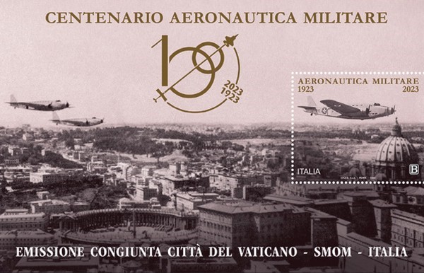 From Enzo Cafaro (Italy): On March 23, 2023, Italy, the Sovereign Military Order of Malta (SMOM) and the Vatican issued each the same souvenir sheet bearing a single stamp at the occasion of the 100th anniversary of the Italian Air Force. The souvenir sheets are showing planes, three-engine Savoia-Marchetti SM82, flying over the town of Rome, more precisely above the Vatican city. The items show also the logo of the anniversary and dates 1923 – 2023. The picture was provided from the SMOM archives.